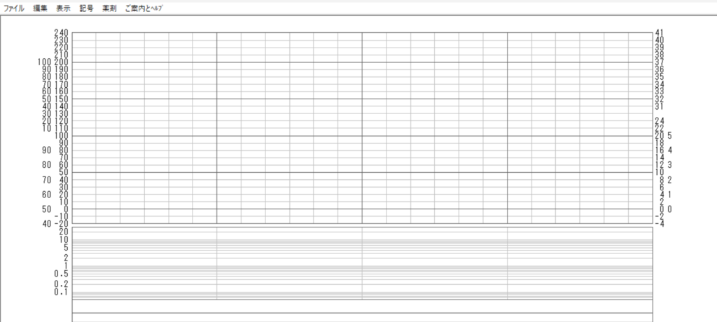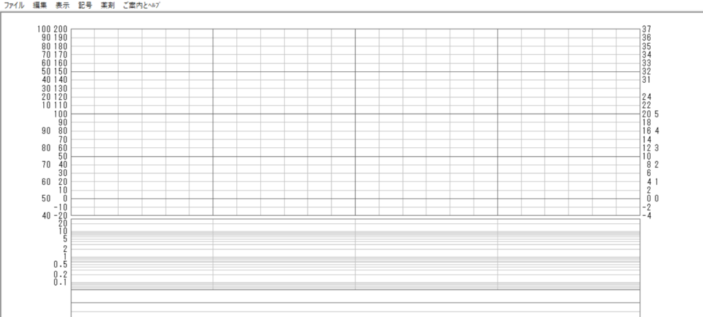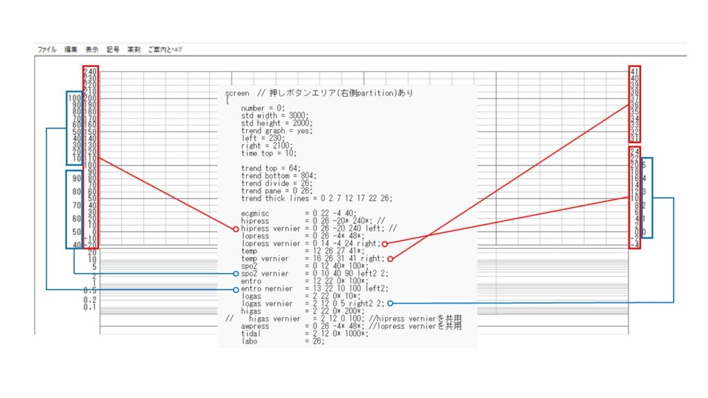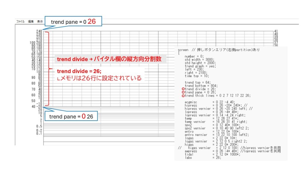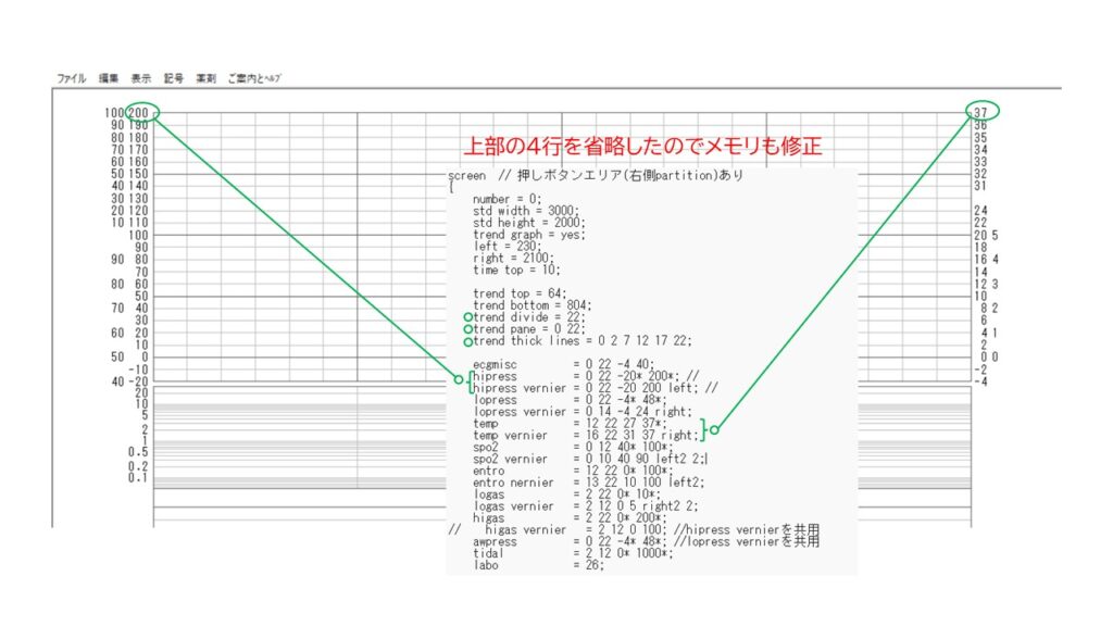 もともと、数値がプロットされるバイタルサイン欄は「26行」に設定されています。これを、バイタルサイン欄の高さ自体は変えずにメモリを数行省略して、メモリ幅を広くしてみます。