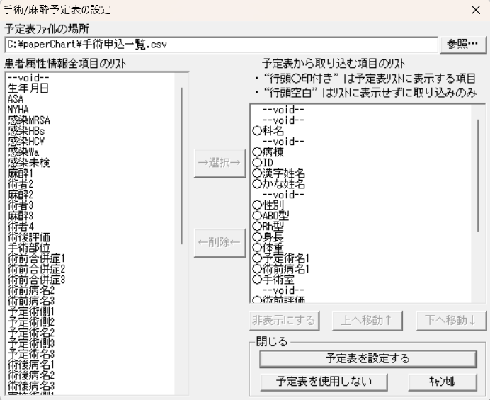 Ks.exe(KickStart)の設定で、表示させたい項目を「患者属性情報全項目のリスト」から選択し、その選択された項目を予定表から取り込む、という流れになります。