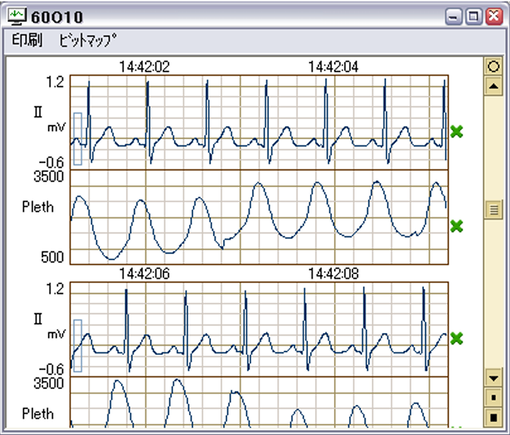 ハートモニタから波形データが出力されている場合は、波形を別ウィンドウに表示します。あるいはバイタルサイン欄をマウス左ダブルクリックしてください。そのクリック場所の時刻近辺の波形を表示します。