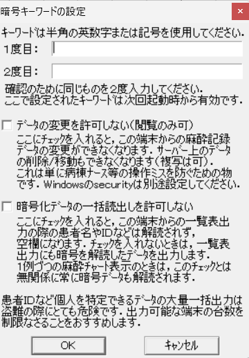暗号キーワード文字列は、それ自体が暗号化されて暗号キーワードファイル(LOG\keycode.txt)に保存されます。何らかの都合で暗号キーワードファイルが無効化されたとき(再インストールなど)も暗号キーワードの再入力が必要になります。