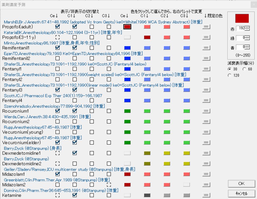 この画面は薬剤濃度予測欄をマウス左クリックしても表示されます。この設定画面で「表示」のチェックが入っているコンパートメントが、薬剤の入力に応じて計算され薬剤濃度予測欄にプロットされます。