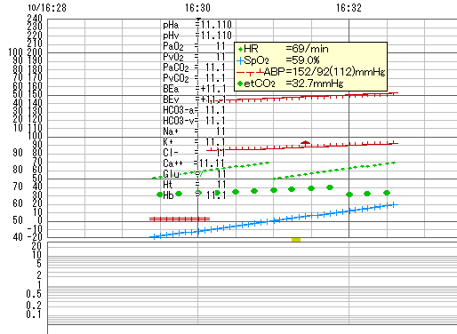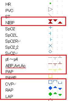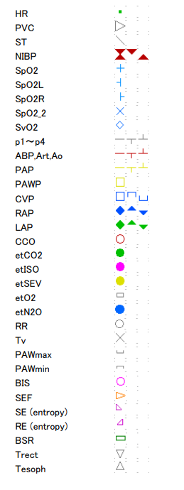 3つの記号が並んでいるもの(血圧)は、左から mean/syst/dias の順です。 脈圧が少なく systolic と diastolic の値が出ないときに mean を表示します。