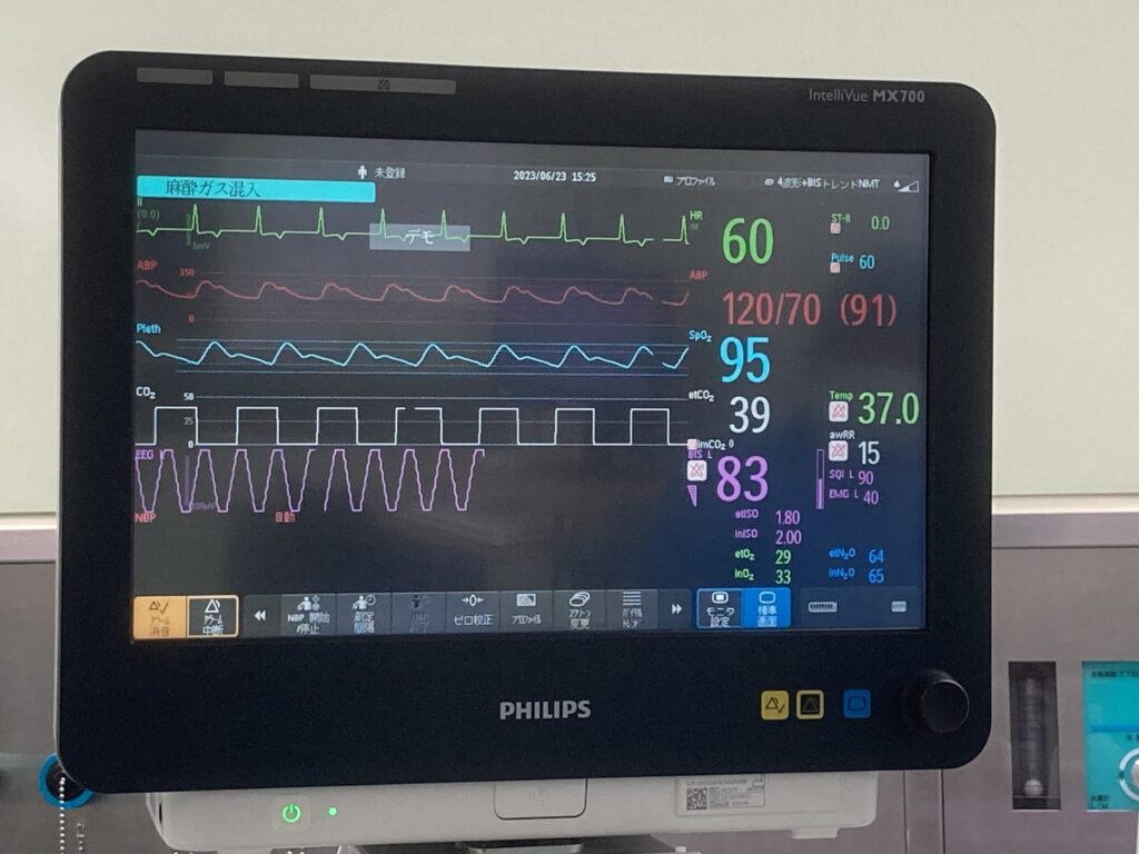 今回は専用部材を持参いただくこともありPhilipsの担当者様にもいらしていただきました。そして、モニタ側の設定をデモモードでもpaperChartがデータを拾えるようにしていただきました。