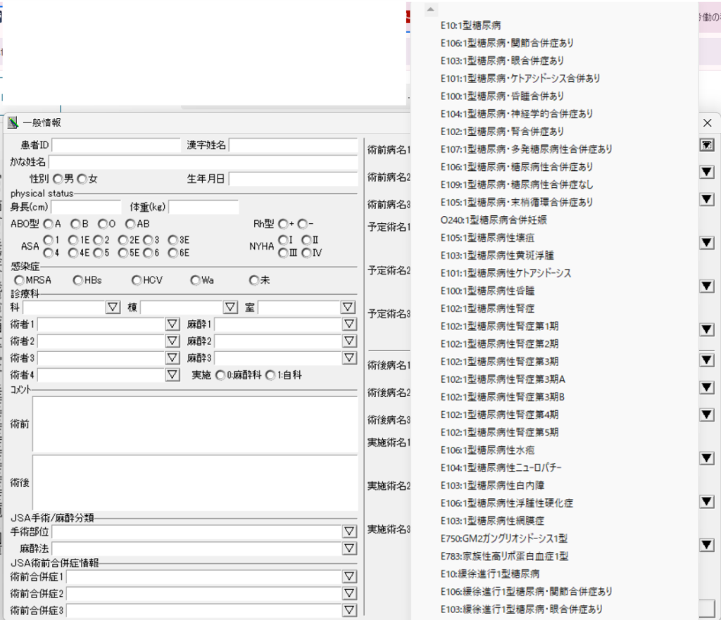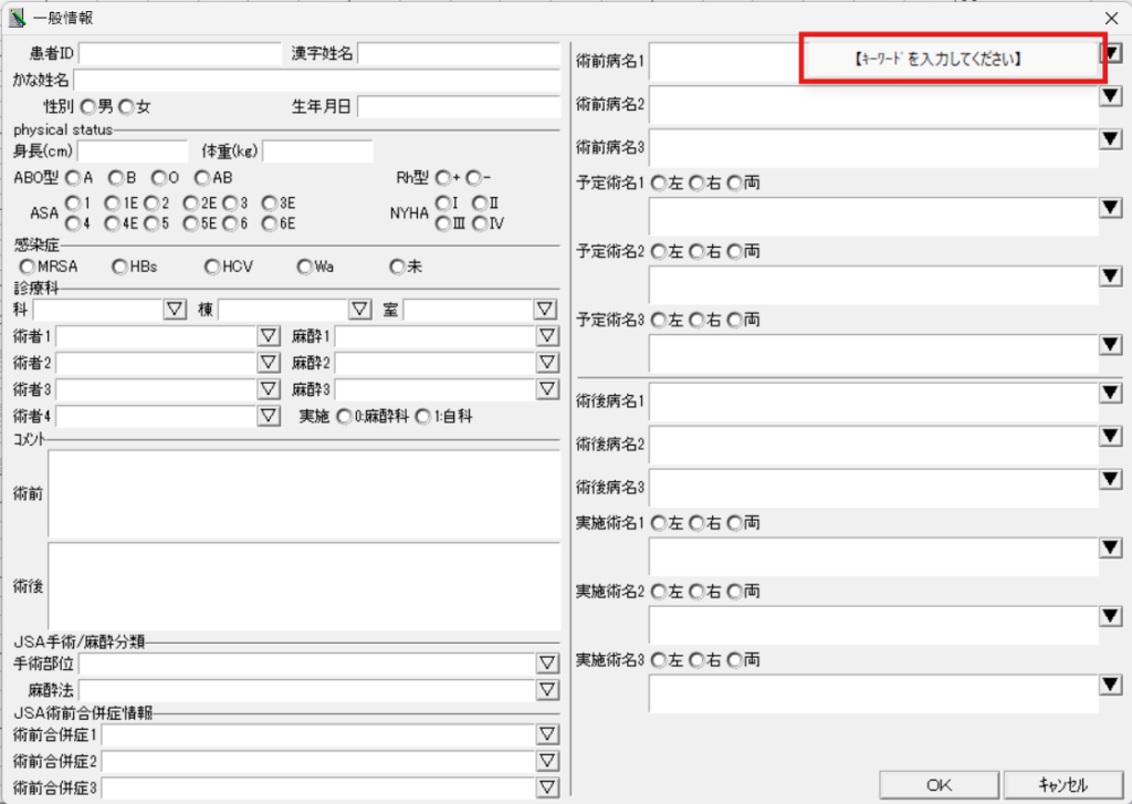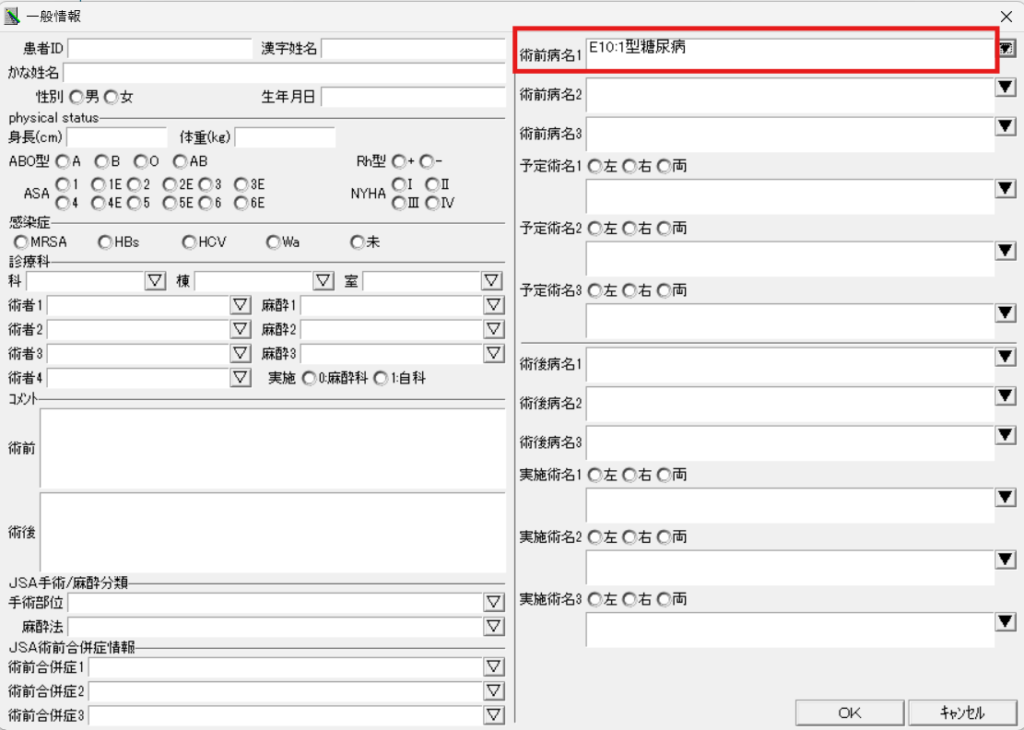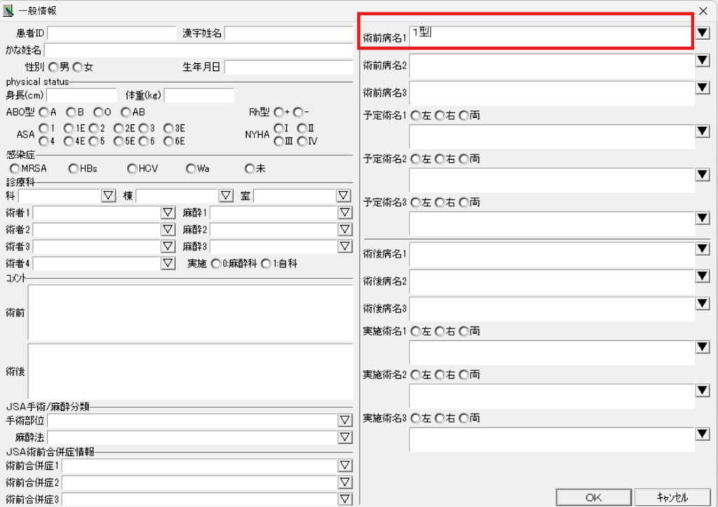 病名は、一般情報の「術前・術後病名」に、術名は「予定術名・実施術名」に使われます。