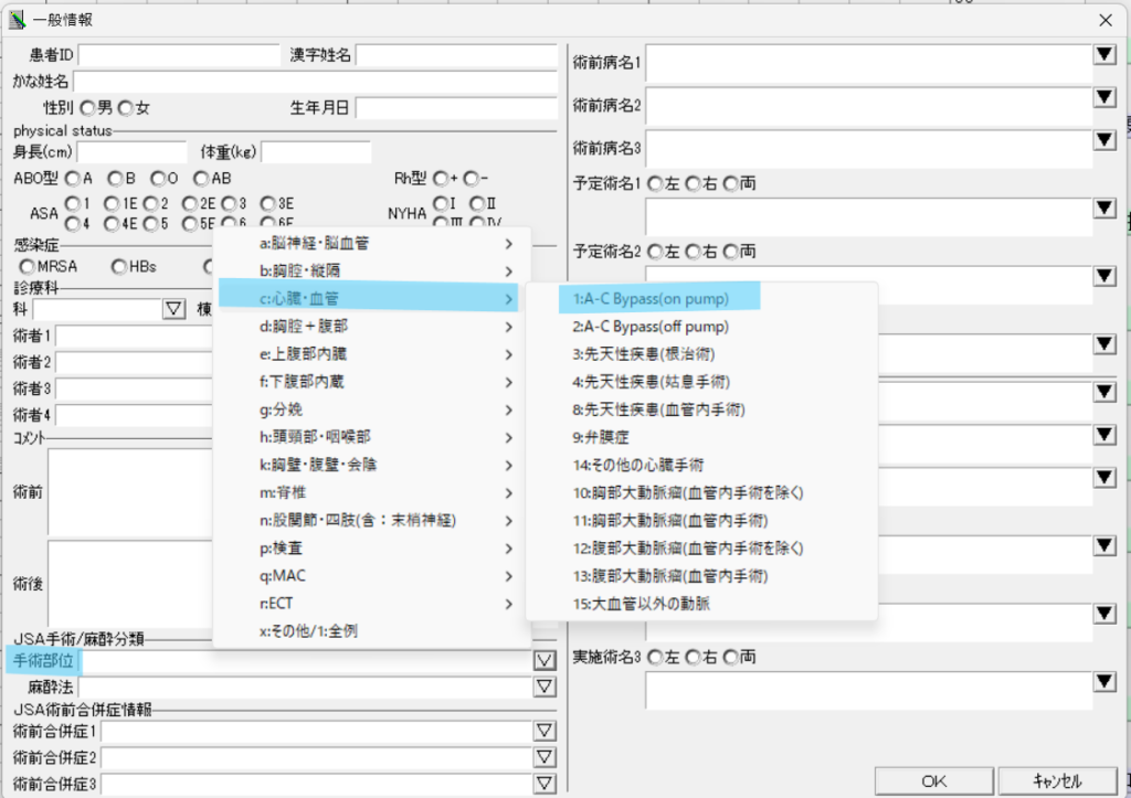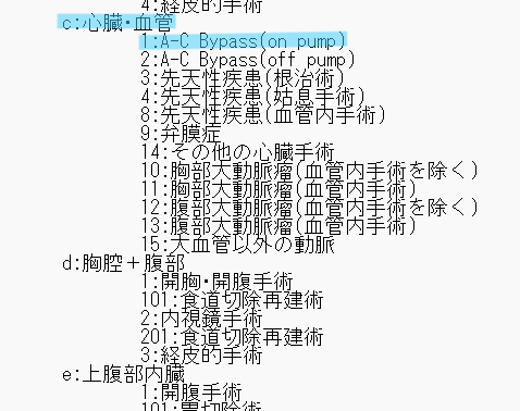 さらに“c:心臓・大血管”の子項目として“1:A-C Bypass (on pump)”などが作られます。