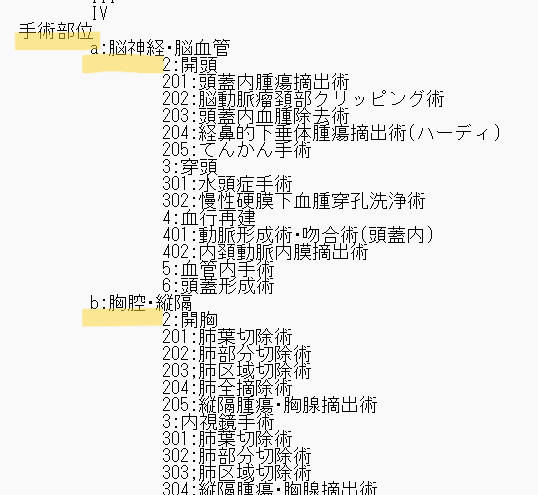 たとえば、dmgcnf.txt 内で“file = JSA 選択. txt#手術部位;” とした場合、メニュー項目は“a:脳神経・脳血管”、“b:開胸・縦隔”…となります。